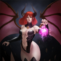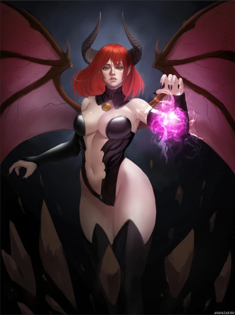 red hair and pointed ears, which are common features of succubus representations in fantasy artwork. She is holding what appears to be