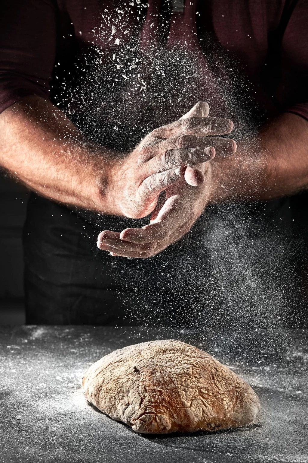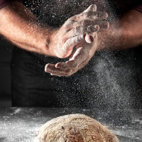 The image depicts a person's hands kneading dough on a table. There is flour being spilled around them, suggesting the process of making bread or pastry. The focus is on the action of kneading, which is a common step in preparing bread or similar
