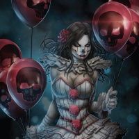 dark hair and is wearing makeup that includes red around her eyes. The girl is holding up several balloons, each with