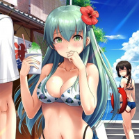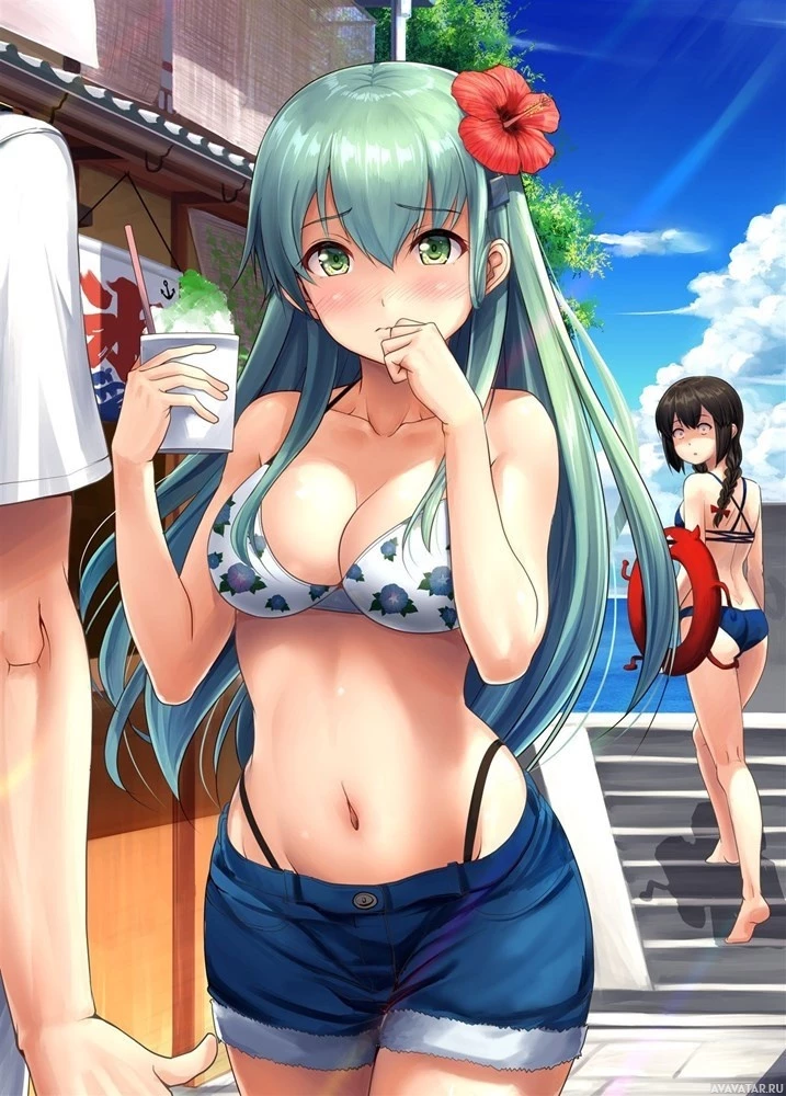 a female character with turquoise hair, wearing a bikini top and shorts. She appears to be enjoying her time at what looks like a beach or outdoor