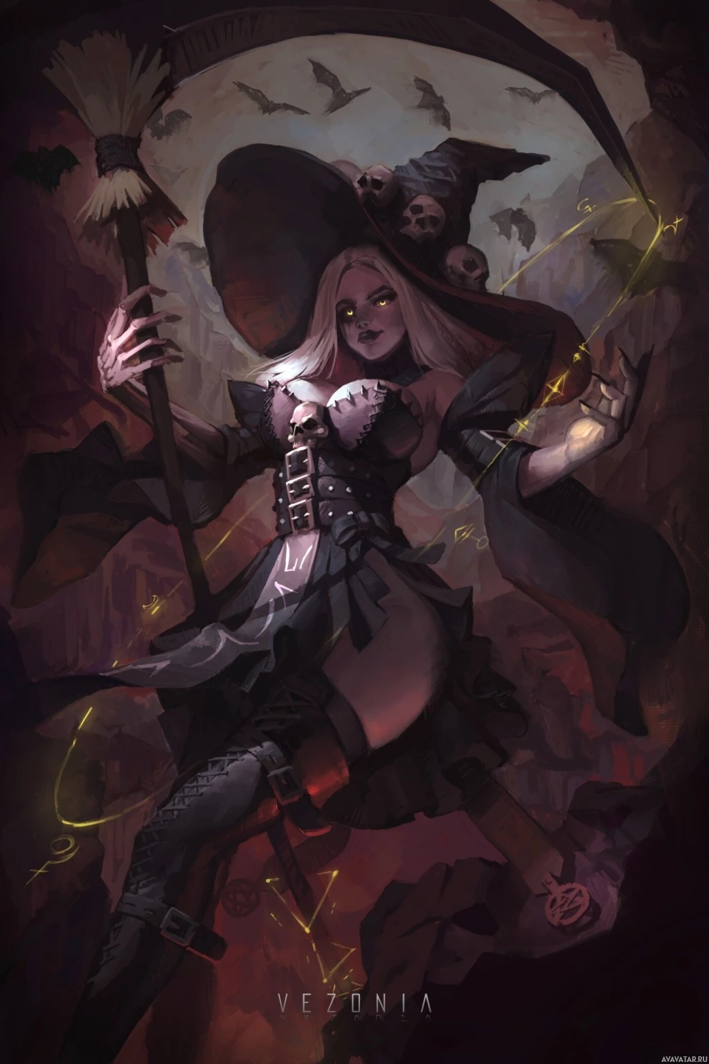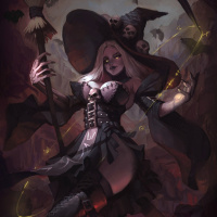 a fantasy character, a witch. She is wearing a dark robe and hat, which are traditional symbols of the witch archetype in