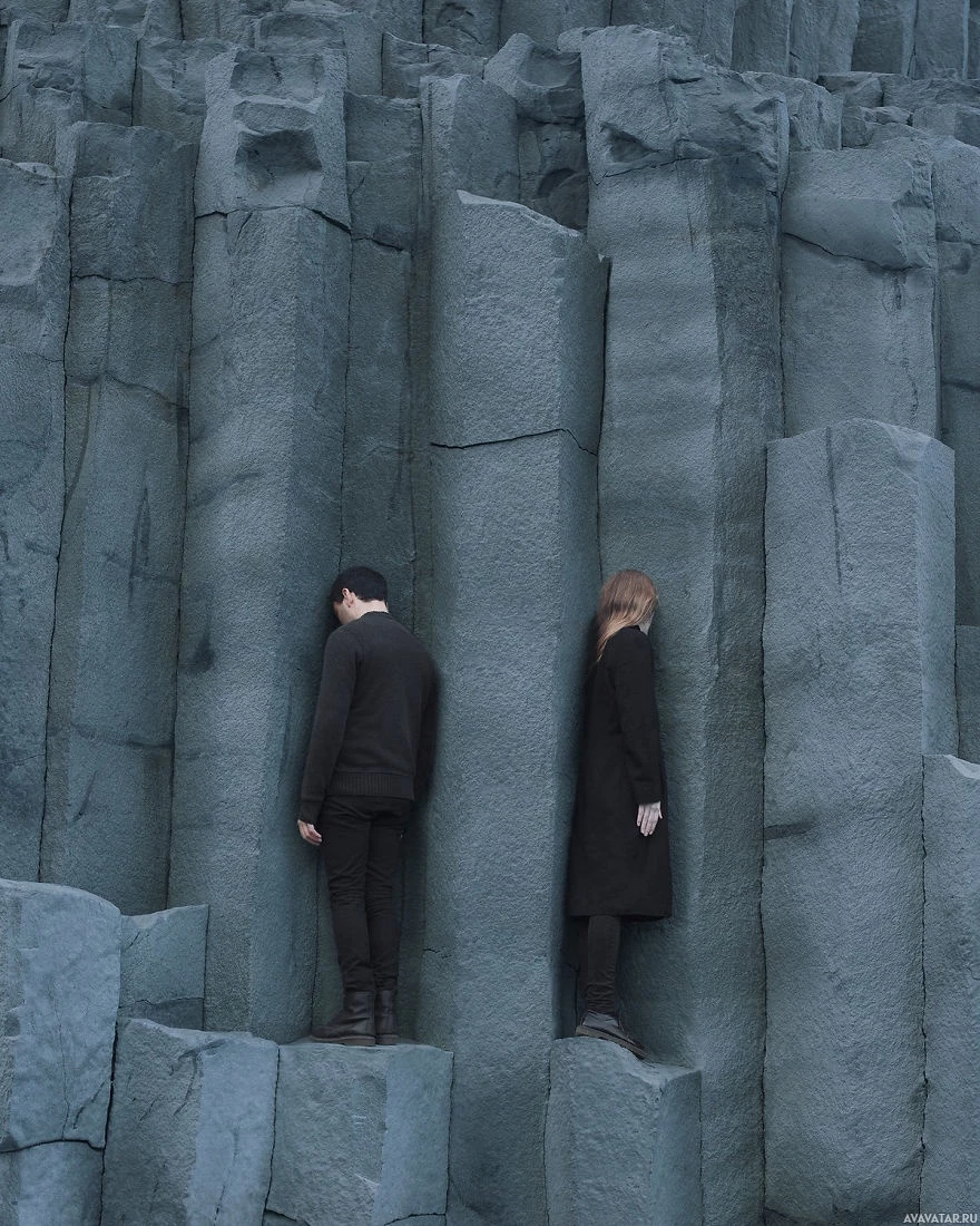 casual attire suitable for cold weather, and they seem to be observing the landscape around them. The setting is quite dramatic due to the contrast between the people and the large, jagged