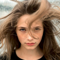 a young girl with long, wavy hair. Her eyes are looking directly at the camera and she has