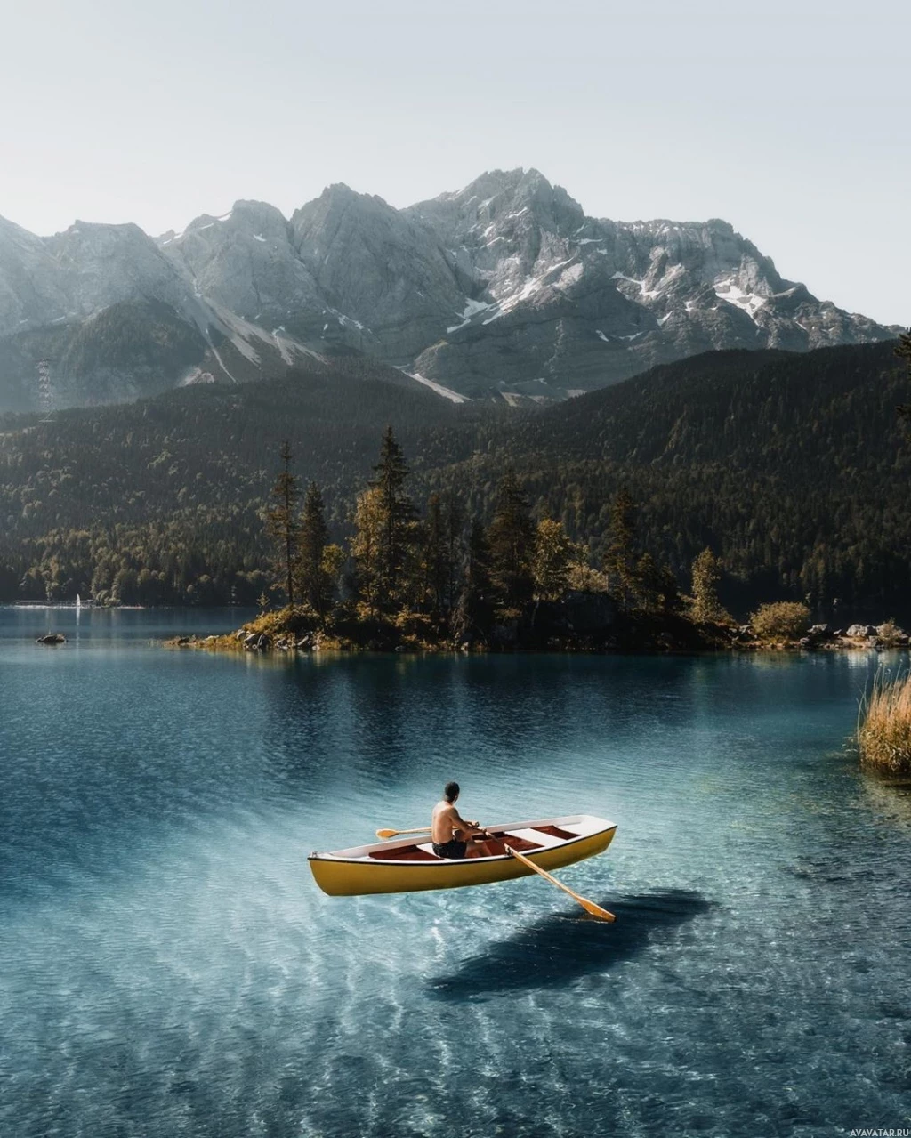 The image shows a person in a canoe on