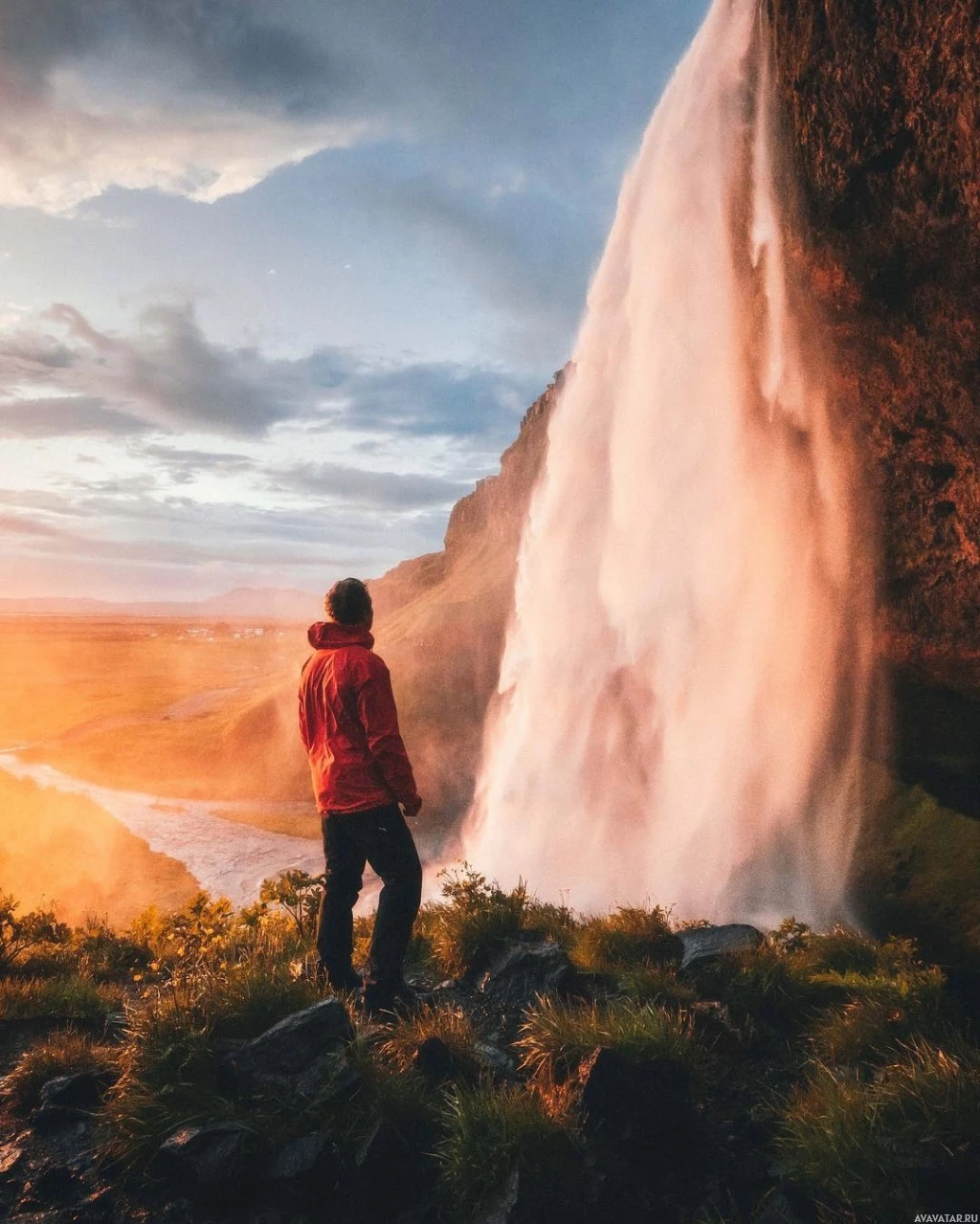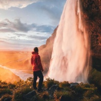 The image depicts a person standing on a cliff overlooking a stunning waterfall at what appears to be either sunrise or sunset, given