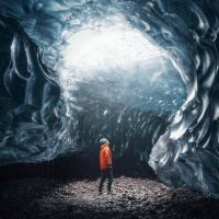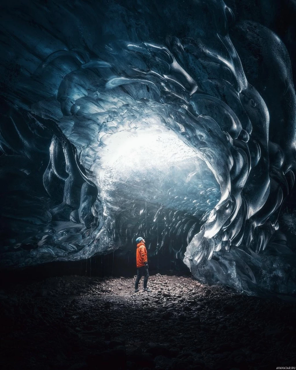 an icy cave where the ice forms have been eroded and shaped over time. There are also some icicles hanging from the ceiling. The image does not contain any other discernible figures, so it can be described as featuring one man in