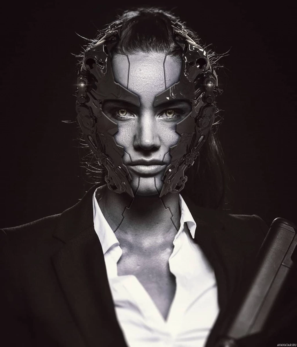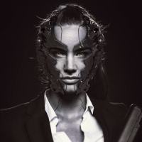 dark hair pulled back and is looking directly at the camera with a serious expression. The mask covers most of her face and features mechanical or robotic elements that give it an industrial or futuristic appearance. There's also a hint of a gun barrel in the lower part of the image, suggesting she might be holding a weapon, which would align with the theme commonly associated with characters like