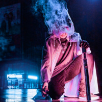a neon sign or lighting fixture in the background. The overall mood of the image is dramatic and somewhat mysterious due to