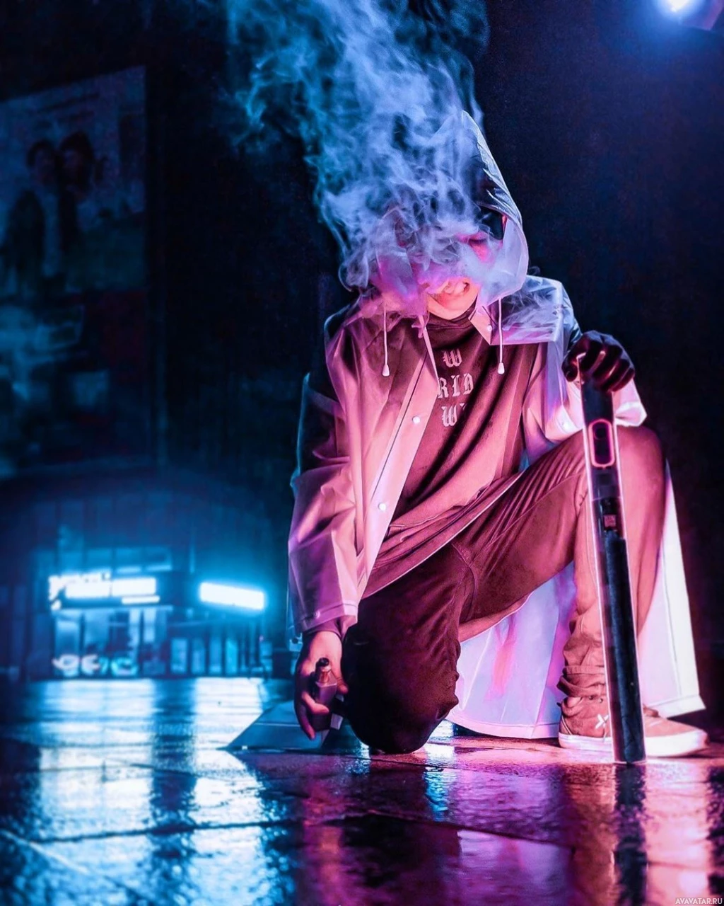 a hooded cloak and have their head tilted back in a posture that suggests they are breathing in the vapor from the device in their hand. This could be interpreted as "vaping" due to the smoke-like effect of the vapor being exhaled. The setting seems to be at night, given the darkness and the illumination provided by what appears to be