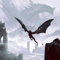 a rocky outcropping with a small figure perched on it, looking up at the dragon. Beyond this, there is a castle-like structure set amidst mountainous terrain, suggesting a setting that could be from