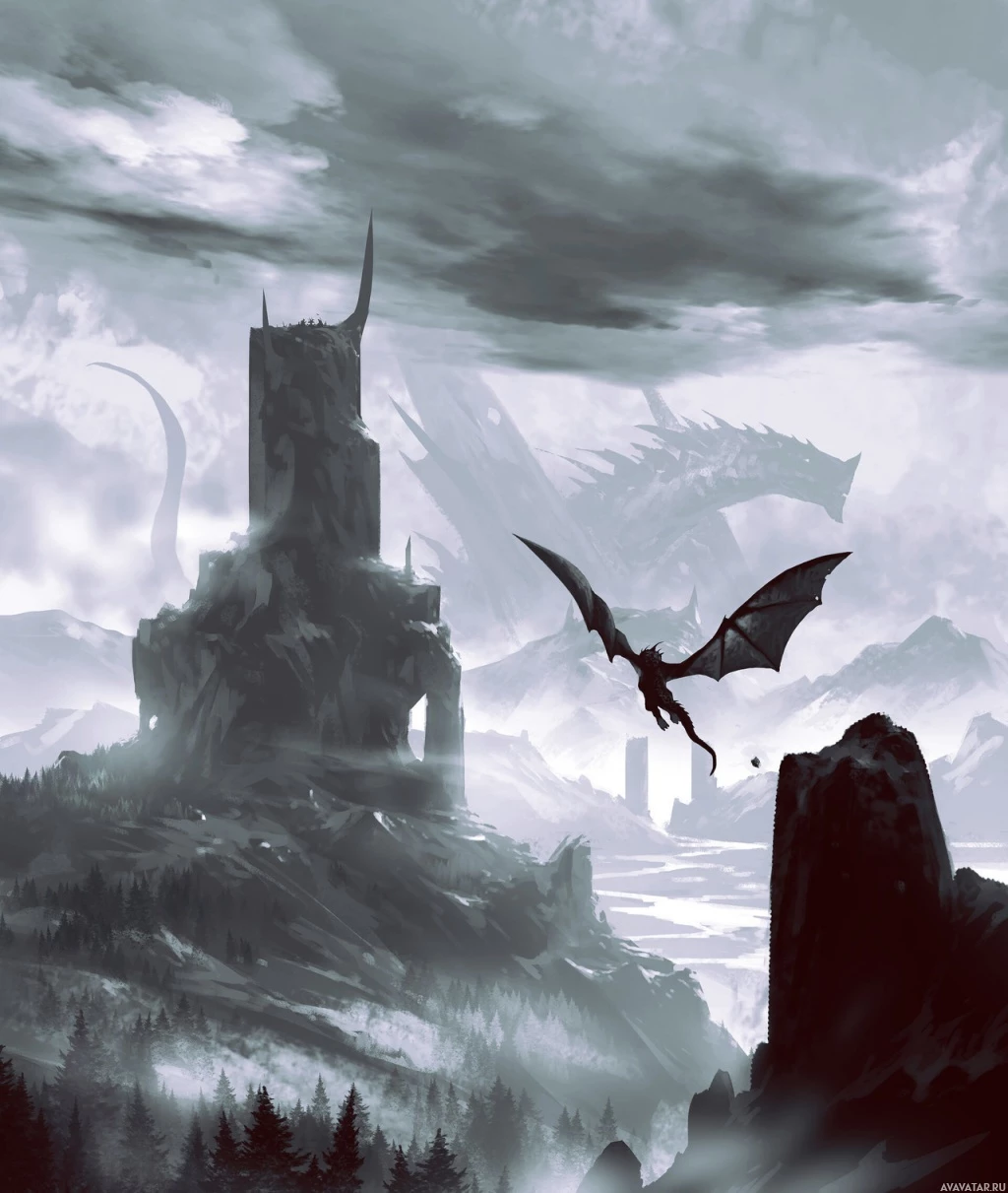 a fantasy scene with a dragon soaring in the sky. In the foreground, there is