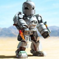 На картинке изображена фигурка Lego в окружении, похожем на пустыню. Скорее всего, это сцена из вселенной "Звездных войн", где персонажи часто изображаются в виде минифигурок Lego. Персонаж, кажется, стоит посреди скалистой местности с горами, виднеющимися вдалеке под ясным небом.
