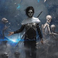 skeleton figures on either side, all seemingly under the control or leadership of the central figure. The background has a desolate, icy feel with blue tones, suggesting a cold,