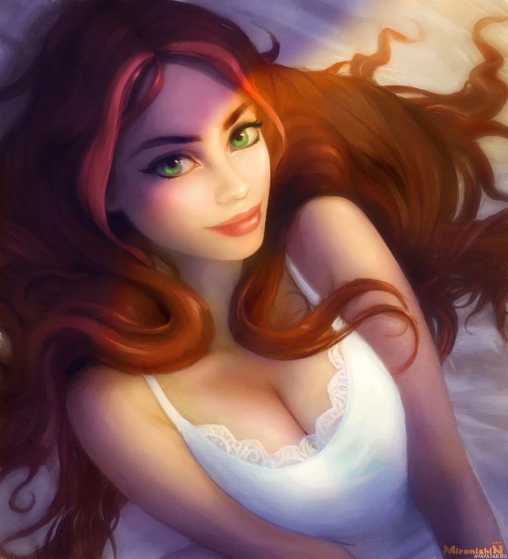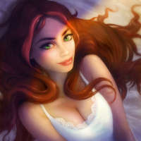 illustrated character of a red-haired girl lying on her back with her head resting on her hand. She appears to be smiling and relaxed, possibly enjoying some downtime or daydreaming. Her eyes are closed, which gives her