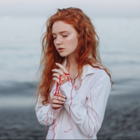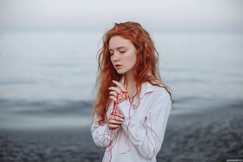 a young woman with red hair, dressed in what appears to be a white top. She is standing on a beach near the water's edge and seems to be looking out towards the sea. In her hands, she holds some kind of fabric or material that has a vibrant