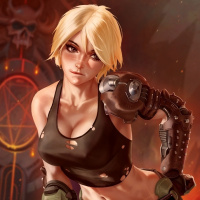 blonde hair, wearing futuristic armor and holding what looks like a weapon. The setting seems to be a volcanic or fiery environment, suggesting that the character is in some sort of