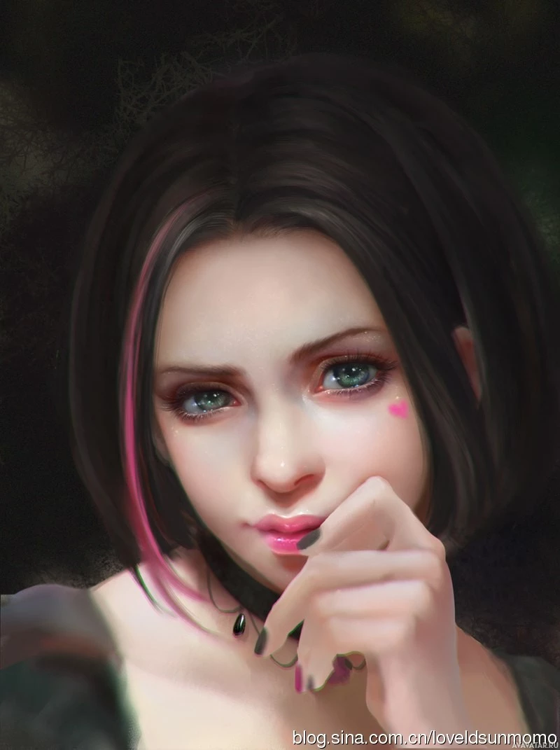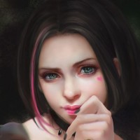 dark hair with pink highlights and is wearing makeup that includes pink lips. Her expression appears thoughtful or contemplative, as she is resting her chin on her hand. The background is not distinctly visible due to the focus on the character's face and the close-up nature of the artwork. The style suggests it might be inspired by anime or manga aesthetics.