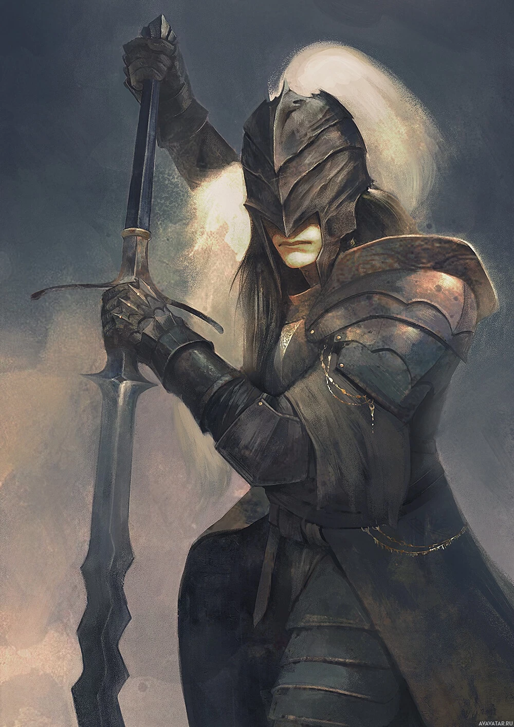 a fantasy setting. The individual is wearing armor and holding a sword in one hand, suggesting they are prepared for combat. They have