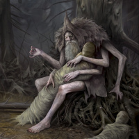 The image shows a fantasy or horror-themed scene set in a forest. There is a figure that resembles an elderly, haggard man with long
