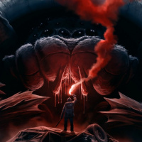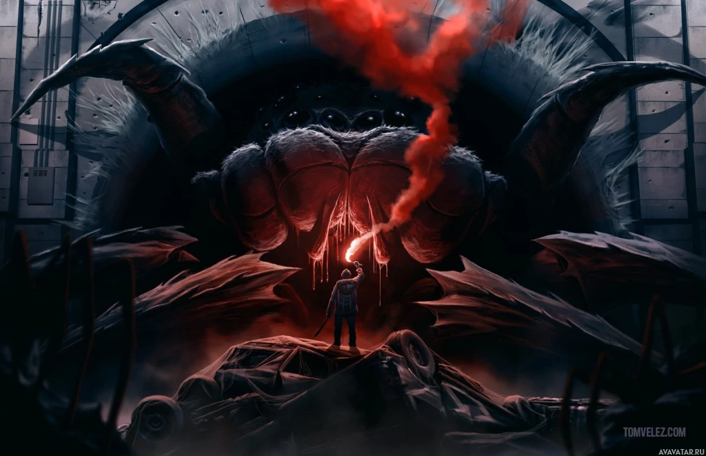 red eyes, possibly guardians or creatures that are meant to represent danger or a challenging obstacle. The person standing outside is holding a torch and appears to be looking at the structure, perhaps contemplating entering it despite