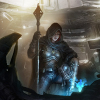 a female warrior or mage. She is wearing a cape, which might suggest she is part of a knightly order or perhaps a magical guild. The background suggests