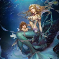 a fantastical scene with a mermaid and a young child. The mermaid, adorned in aquatic attire that resembles