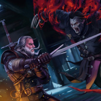 the video game "The Witcher 3: Wild Hunt," featuring the protagonist, Geralt of Rivia, in combat with a vampire. Both characters are armed and engaged in action; Geralt is wielding swords, while the vampire has red energy or blood-like effects around it, possibly representing its