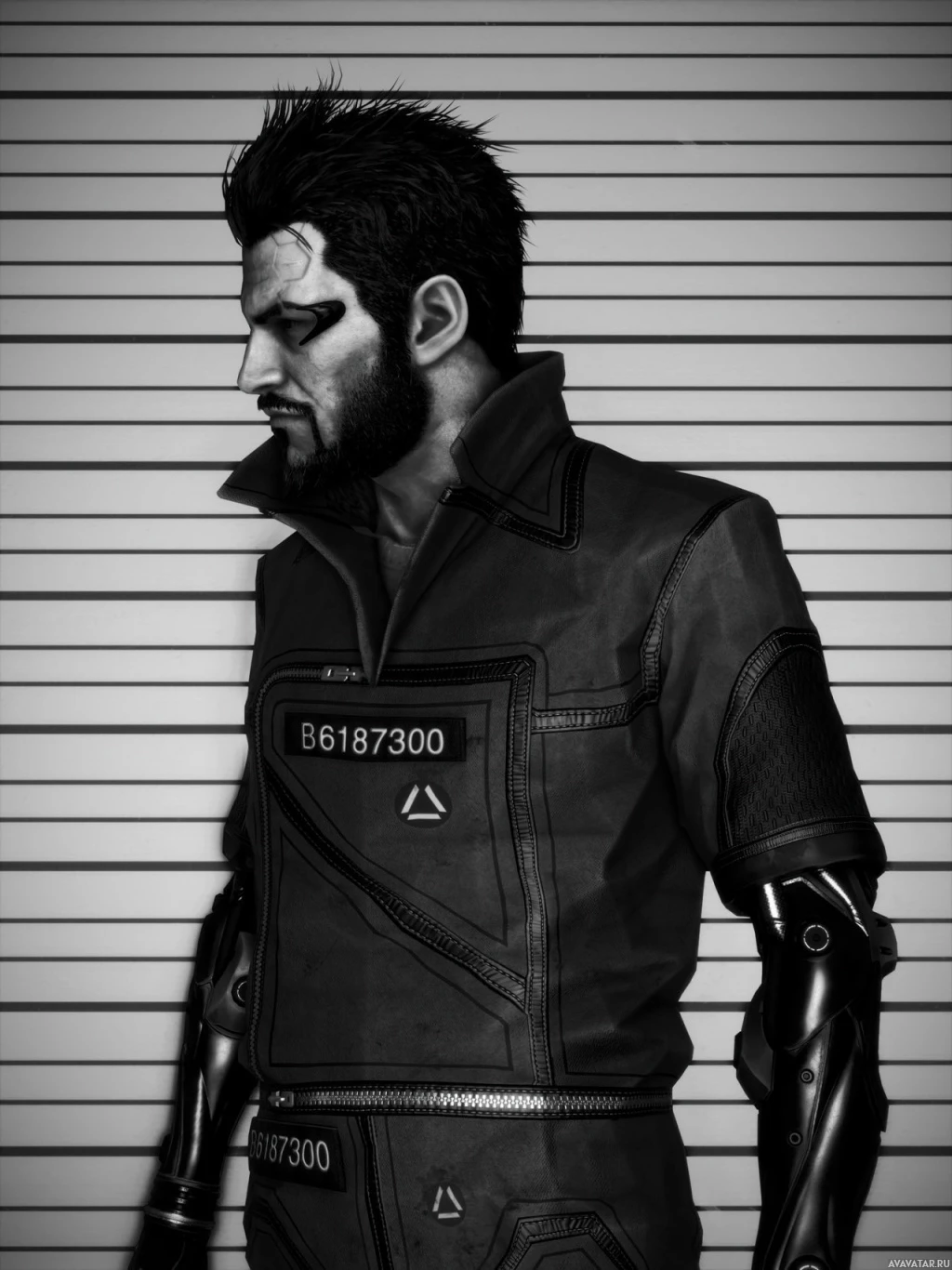 a stern expression and is wearing a tactical vest with some sort of logo or emblem on it. On his left shoulder, there's a visible tattoo or marking, which could be related to the game's storyline or faction he belongs to. The character is also wearing what seems to be an electronic implant on his right side, possibly indicating