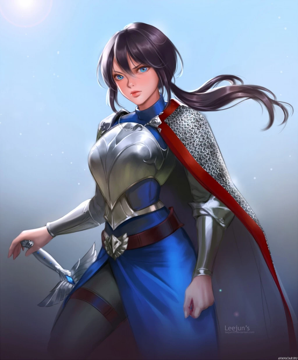 intricate designs, a blue tunic with red trim, and she carries a sword in her right hand. The style of the illustration is reminiscent of comic book artwork.