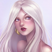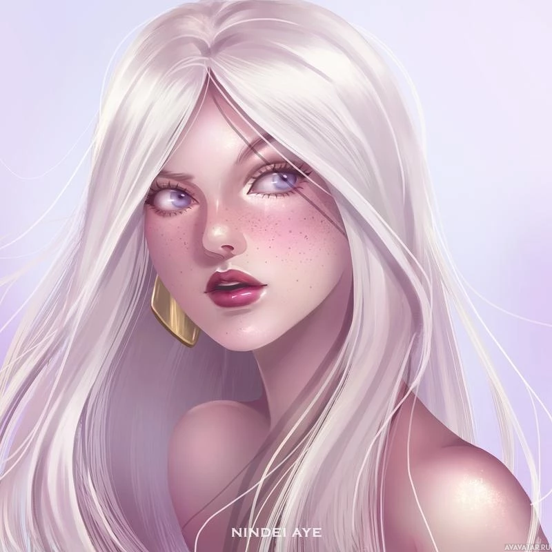 white hair and what appears to be a fair complexion. She has detailed facial features, including pinkish freckles, rosy cheeks, large