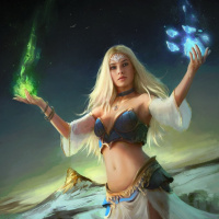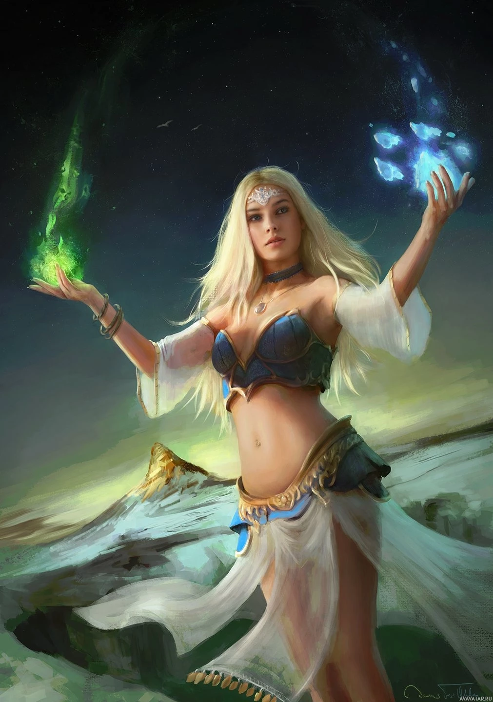blonde hair. She is depicted as a character in a setting that resembles a mystical or magical environment, possibly