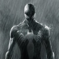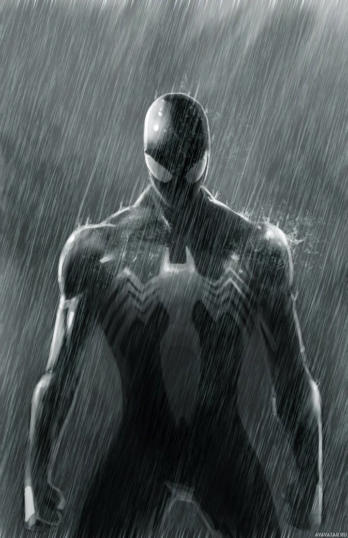 The image features a character that is commonly known as Spider-Man, standing in the rain. This character is often associated with