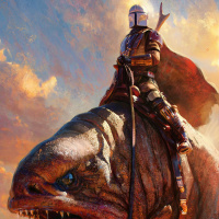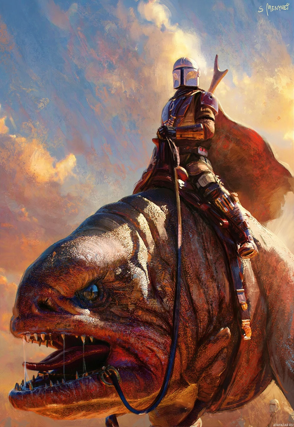 the Star Wars franchise, known as "The Mandalorian." This character is shown riding on top of an armored fish creature, which resembles