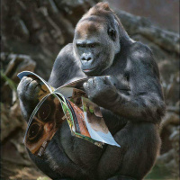 a moment of playfulness or curiosity as the gorilla appears to engage with the content of the book.