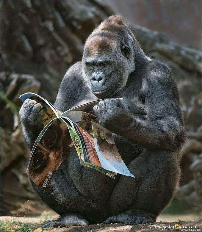 The image shows a gorilla sitting down and looking at a magazine or book. The gorilla is holding the book with both hands, which is an action that is more commonly associated with humans rather than animals. This creates