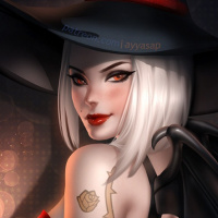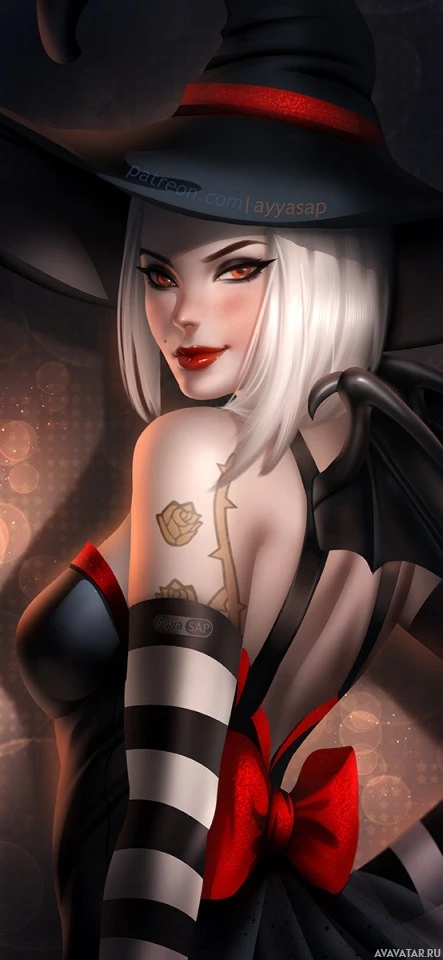 white hair and wearing a hat. She is dressed in a costume that resembles a witch's outfit, complete with a cape and what seems to be makeup or prosthetics to enhance the appearance of her witch-like features. The character is posed with confidence, standing against a backdrop that suggests a night setting with