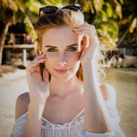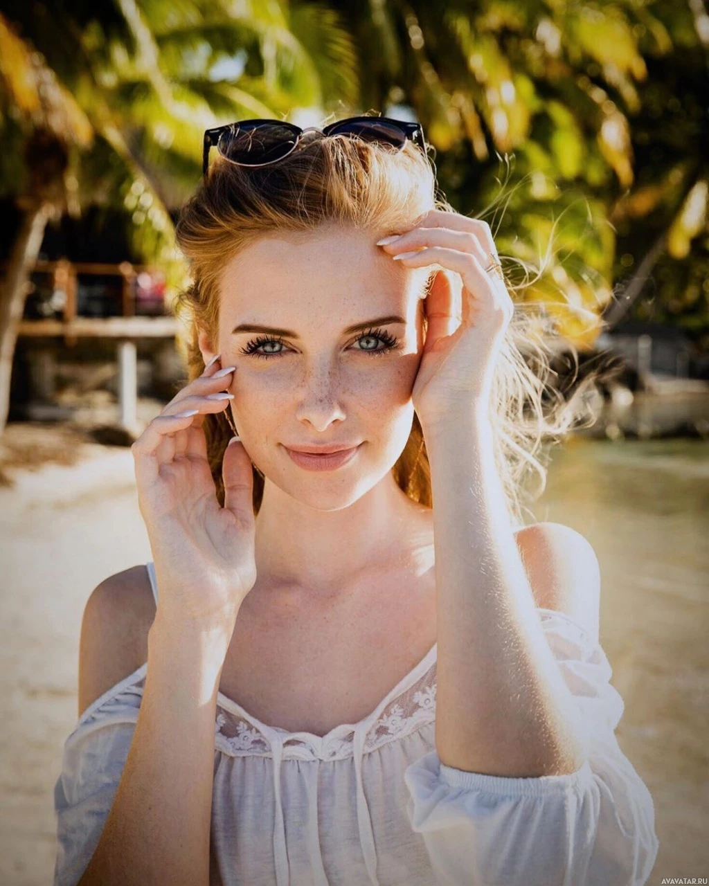 light skin, is wearing sunglasses on her head, and appears to be looking directly at the camera with a relaxed expression. Her hair is styled down and she's dressed in