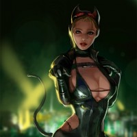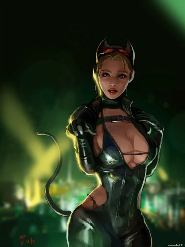 goggles on top of a cowl that frames her face. Her pose suggests readiness or vigilance. The background has a noir-style ambiance, with spotlights illuminating parts of the scene, which adds to