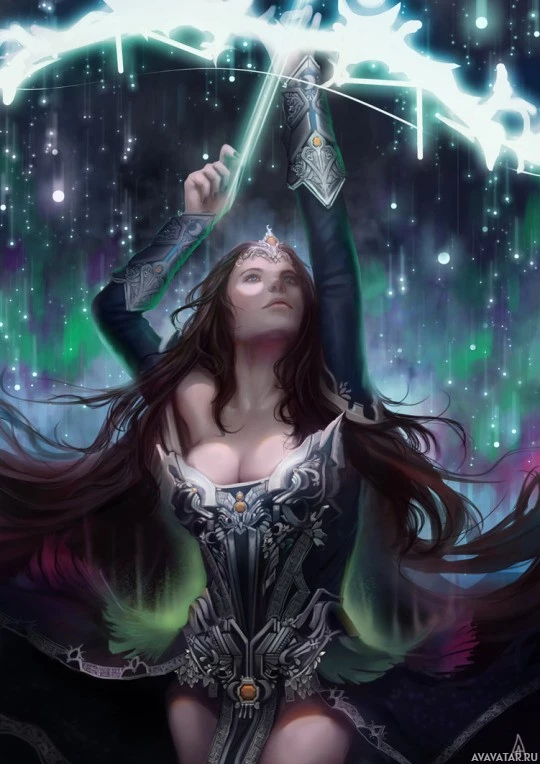 a character from the game Dota 2. She is shown wielding a bow and seems to be in a magical or mystical setting with stars and