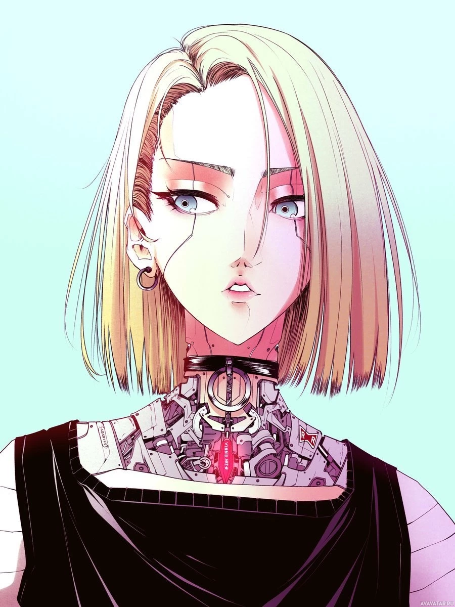 На картинке изображена девушка со светлыми волосами. У нее множество татуировок и пирсинга, в том числе на подбородке. Героиня изображена с задумчивым выражением лица и в темном топе, открывающем часть груди.