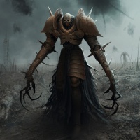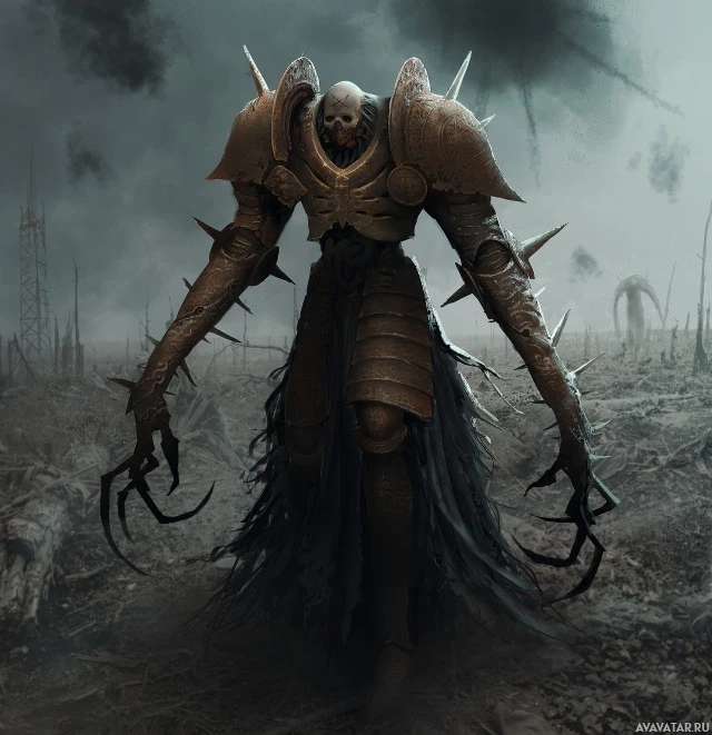 armor pieces and a tattered cloak or garment that resembles bones, giving it a menacing appearance. The background suggests a desolate or war-torn landscape, further enhancing