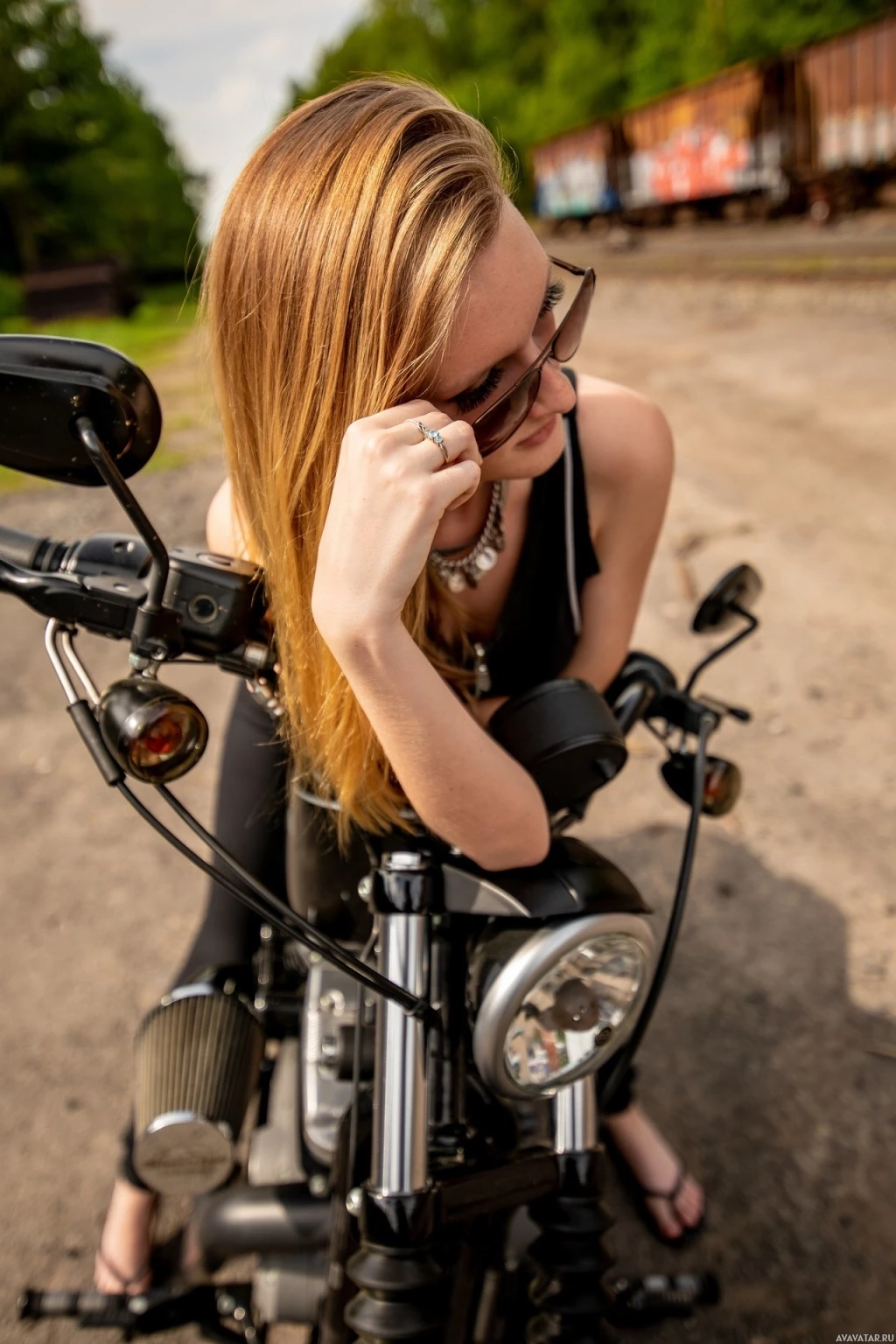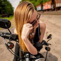 На картинке изображена молодая рыжеволосая женщина в солнцезащитных очках, сидящая на мотоцикле. Ее рука покоится на руле мотоцикла, припаркованного на грунтовой дороге рядом с чем-то похожим на железнодорожные пути. Обстановка напоминает дневное время на открытом воздухе.
