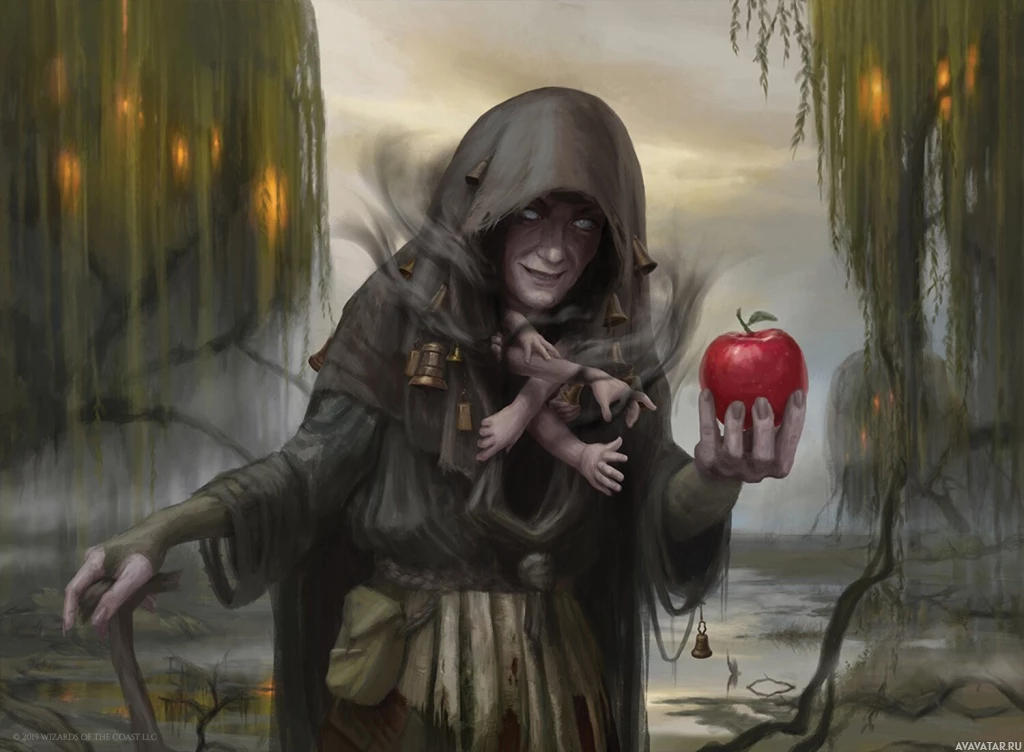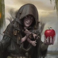 a human skull, which adds a macabre touch to the scene. Her right hand is holding an apple, symbolizing temptation or magic in folklore. The background is a misty,