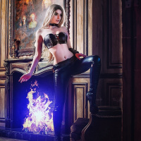 powerful look. The setting looks like a room with decorative elements in the background, which adds to