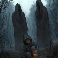 supernatural entities or creatures from folklore, such as ghouls or witches. The setting appears to be a desolate forest or woodland at night, which adds to