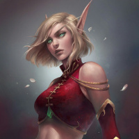 blonde hair and is wearing a red outfit with gold accents, which could suggest armor or ceremonial wear. There are also elements that resemble jewelry and possibly