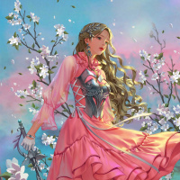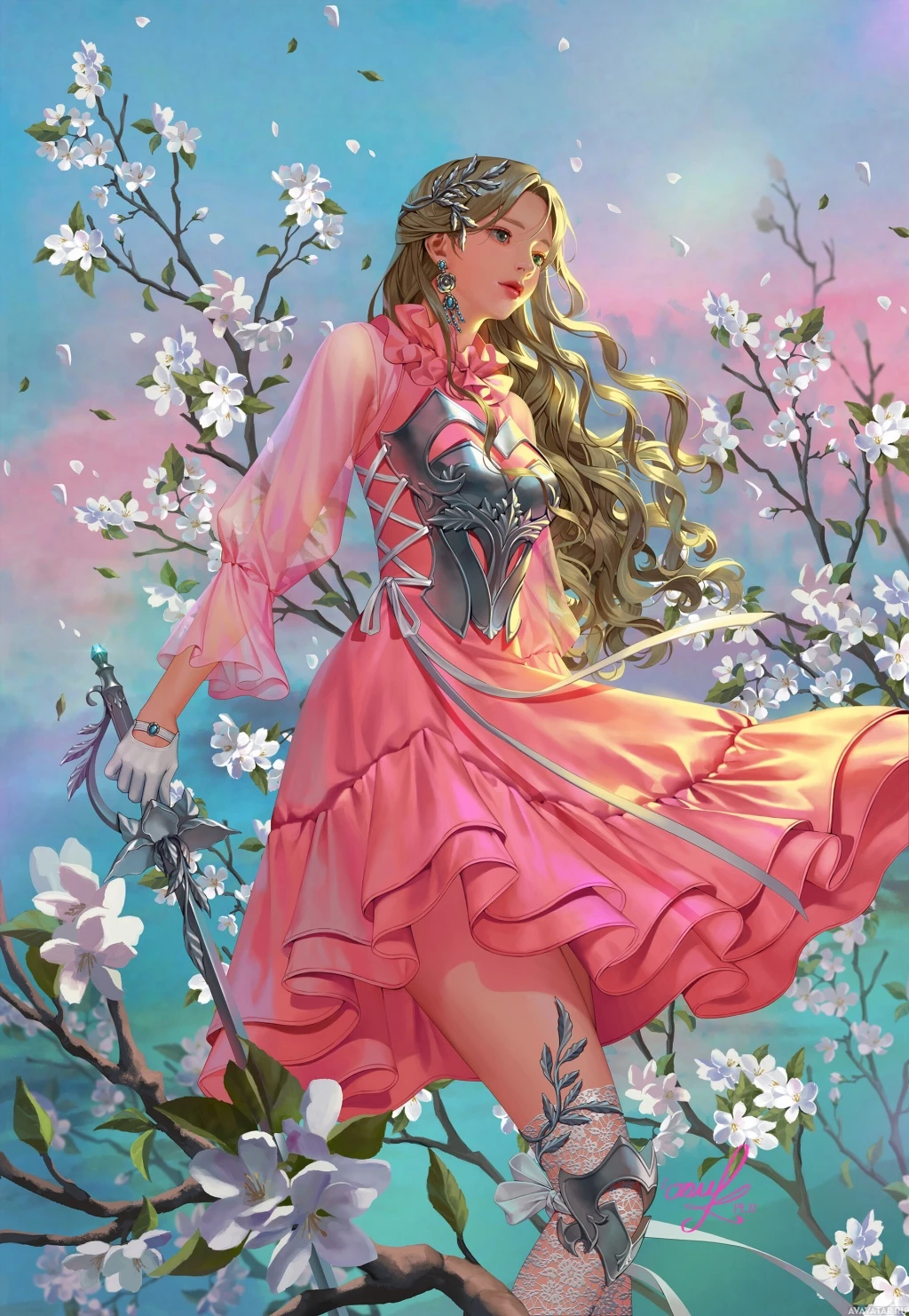 pink dress that has a fantasy-like design. The dress features ruffles and lace detailing, suggesting a regal or formal style. In her left hand, she holds what appears to be a staff or wand, which adds to the fantastical theme of the image. She is standing on branches that are laden with