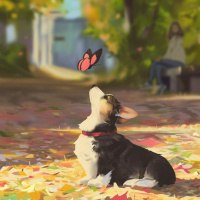 a Corgi dog sitting on the ground with its head turned upwards, appearing to be watching something. In front of the dog, there is a butterfly fluttering in the air. This scene conveys