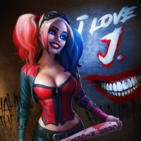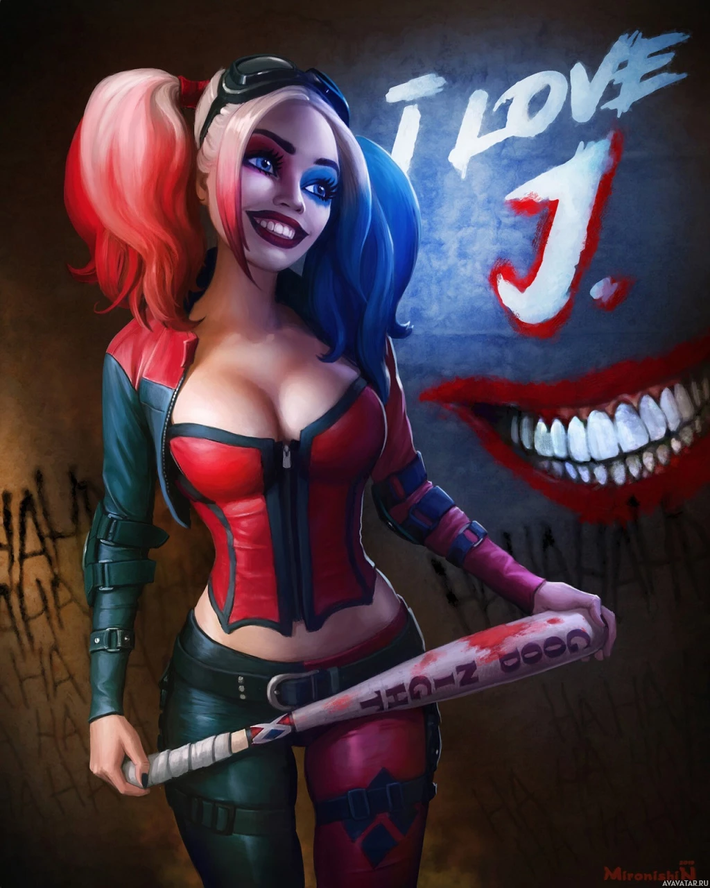 a baseball bat, which is a characteristic accessory associated with her character. Behind Harley Quinn, there is graffiti that reads "I Love Joker", indicating her romantic relationship with the Joker, another