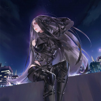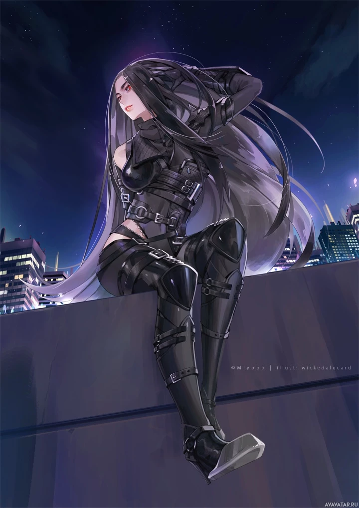 На картинке изображен темноволосый женский персонаж, одетый в одежду, которая, по-видимому, представляет собой смесь тактического или военного снаряжения с элементами фэнтези. Она сидит ночью на краю крыши. На заднем плане видны городские огни, что наводит на мысль о ночной сцене, происходящей в городской среде. У героини серьезное выражение лица, и она кажется задумчивой или погруженной в себя.